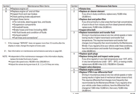 When the estimated remaining oil life reaches 15%, the system is designed to alert you on your dashboard by a “service due soon” message recommending an oil change. In addition to the code for an oil or filter change, (A,B,0) the system may display additional codes (1-9) for other services items that are due for replacement, service or inspection such as: tires, brakes, filters, spark plugs and other fluids that cannot be directly monitored.